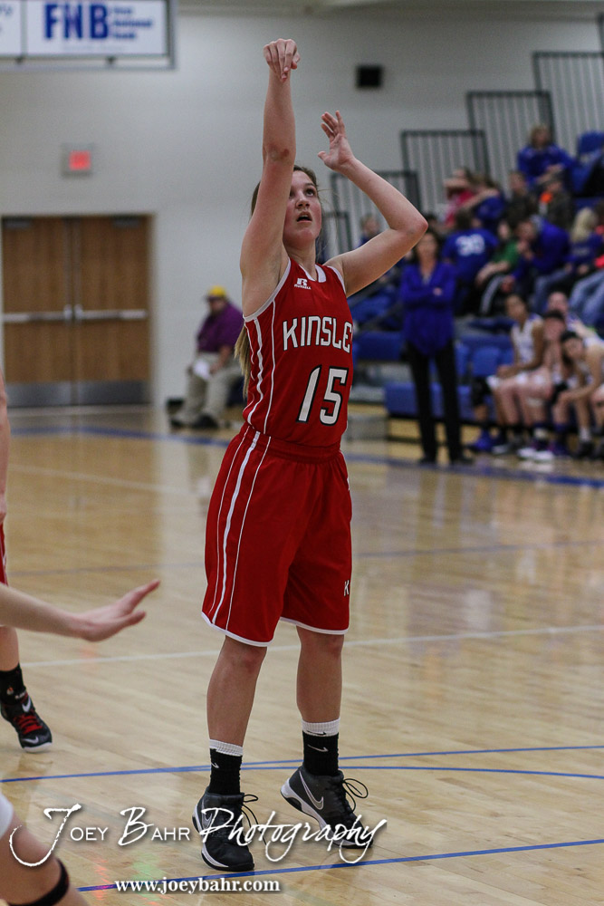 Kinsley Lady Coyote Scout Frame (#15) shoots a free throw during the 2A Sub-State First Round Game with the Spearville Lady Lancers vs the Kinsley Lady Coyotes with Spearville winning 66 to 53 at Spearville High School in Spearville, Kansas on March 3, 2015. (Photo: Joey Bahr, www.joeybahr.com)