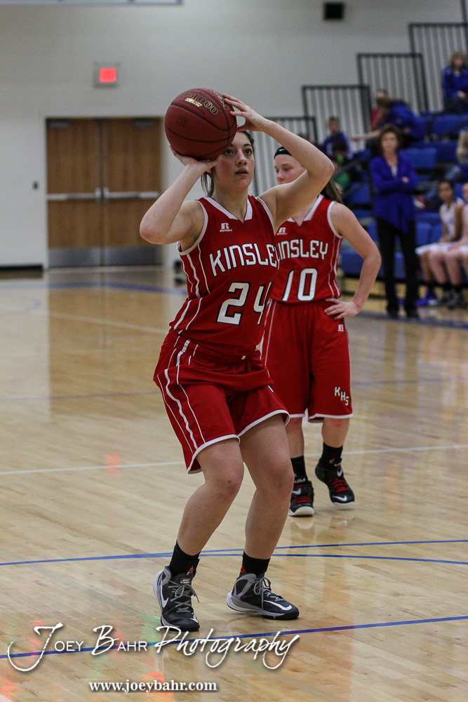 Kinsley Lady Coyote Clarisa Holguin (#24) shoots a free throw during the 2A Sub-State First Round Game with the Spearville Lady Lancers vs the Kinsley Lady Coyotes with Spearville winning 66 to 53 at Spearville High School in Spearville, Kansas on March 3, 2015. (Photo: Joey Bahr, www.joeybahr.com)