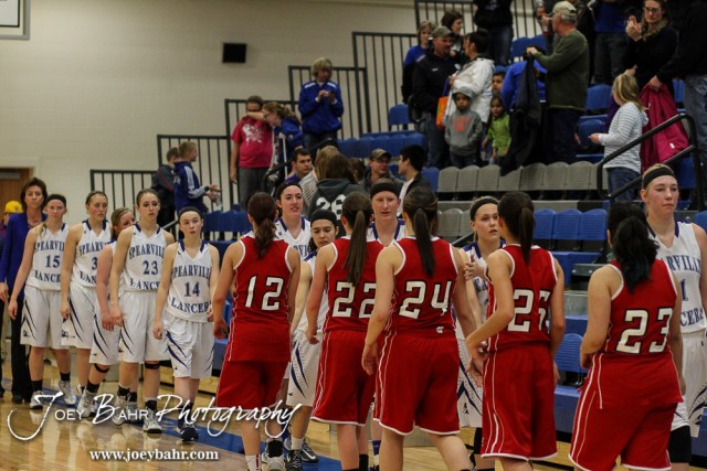 Members of the Kinsley Lady Coyotes and Spearville Lady Lancers shake hands following the 2A Sub-State First Round Game with the Spearville Lady Lancers vs the Kinsley Lady Coyotes with Spearville winning 66 to 53 at Spearville High School in Spearville, Kansas on March 3, 2015. (Photo: Joey Bahr, www.joeybahr.com)