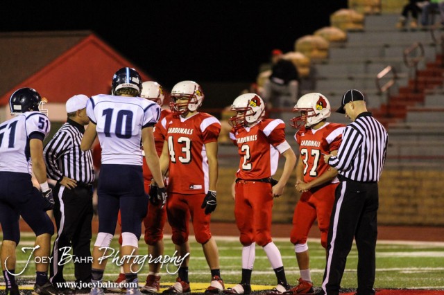 Captains for the Hoisington Cardinals and Cimarron Bluejay meet before the Cimmaron versus Hoisington High School KSHSAA Class 3A Bi-District Football Game with Hoisington winning 48 to 6 at Elton Brown Field in Hoisington, Kansas on November 4, 2014. (Photo: Joey Bahr, www.joeybahr.com)