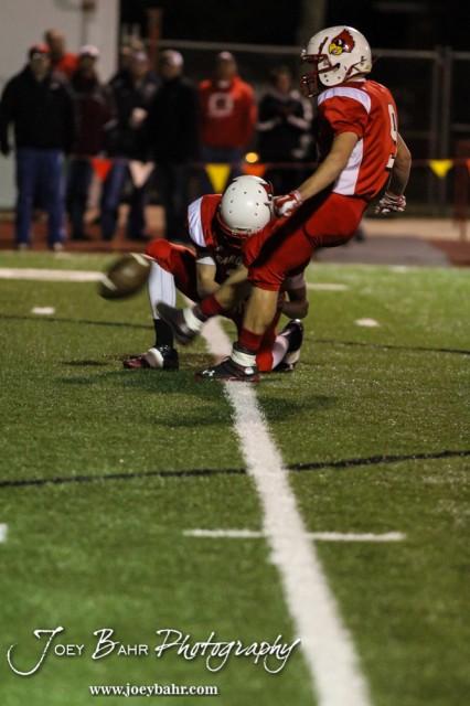 Hoisington Cardinal Brandon Ball (#9) kicks a Point After Touchdown during the Cimmaron versus Hoisington High School KSHSAA Class 3A Bi-District Football Game with Hoisington winning 48 to 6 at Elton Brown Field in Hoisington, Kansas on November 4, 2014. (Photo: Joey Bahr, www.joeybahr.com)