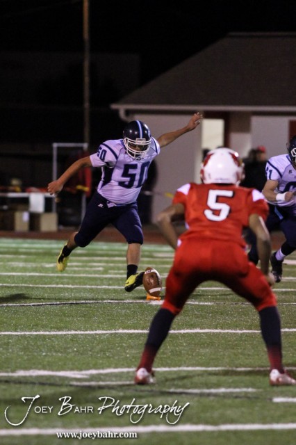 Cimarron Bluejay Merced Corrales (#50) kicks off the ball during the Cimmaron versus Hoisington High School KSHSAA Class 3A Bi-District Football Game with Hoisington winning 48 to 6 at Elton Brown Field in Hoisington, Kansas on November 4, 2014. (Photo: Joey Bahr, www.joeybahr.com)