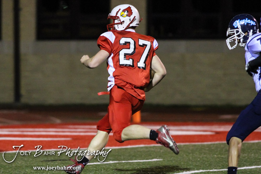 Hoisington Cardinal Hunter Hanzlick (#27) runs for the end zone during the Cimmaron versus Hoisington High School KSHSAA Class 3A Bi-District Football Game with Hoisington winning 48 to 6 at Elton Brown Field in Hoisington, Kansas on November 4, 2014. (Photo: Joey Bahr, www.joeybahr.com)