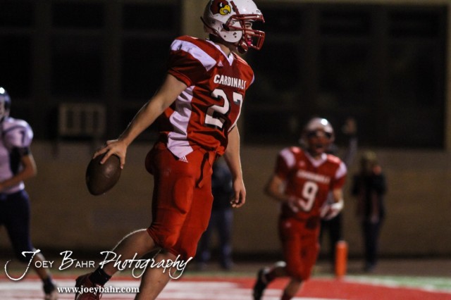 Hoisington Cardinal Hunter Hanzlick (#27) celebrates scoring a touchdown during the Cimmaron versus Hoisington High School KSHSAA Class 3A Bi-District Football Game with Hoisington winning 48 to 6 at Elton Brown Field in Hoisington, Kansas on November 4, 2014. (Photo: Joey Bahr, www.joeybahr.com)