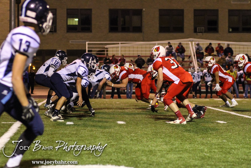 The Cimarron Bluejay line makes contact with the Hoisington Cardinals defense during the Cimmaron versus Hoisington High School KSHSAA Class 3A Bi-District Football Game with Hoisington winning 48 to 6 at Elton Brown Field in Hoisington, Kansas on November 4, 2014. (Photo: Joey Bahr, www.joeybahr.com)