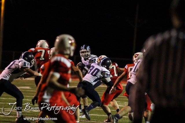 Cimarron Bluejay Nick Ast (#12) looks for an open receiver during the Cimmaron versus Hoisington High School KSHSAA Class 3A Bi-District Football Game with Hoisington winning 48 to 6 at Elton Brown Field in Hoisington, Kansas on November 4, 2014. (Photo: Joey Bahr, www.joeybahr.com)