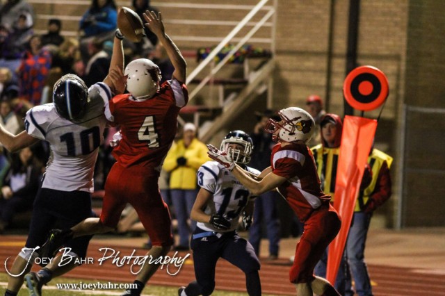 Hoisington Cardinal Steffan Dolechek (#4) breaks up a pass to Cimarron Bluejay A J Cooper (#10) during the Cimmaron versus Hoisington High School KSHSAA Class 3A Bi-District Football Game with Hoisington winning 48 to 6 at Elton Brown Field in Hoisington, Kansas on November 4, 2014. (Photo: Joey Bahr, www.joeybahr.com)