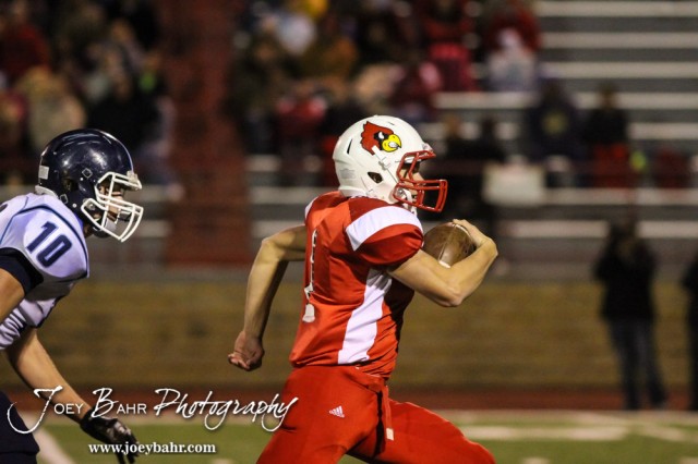 Hoisington Cardinal Tyler Specht (#1) carries the ball during the Cimmaron versus Hoisington High School KSHSAA Class 3A Bi-District Football Game with Hoisington winning 48 to 6 at Elton Brown Field in Hoisington, Kansas on November 4, 2014. (Photo: Joey Bahr, www.joeybahr.com)