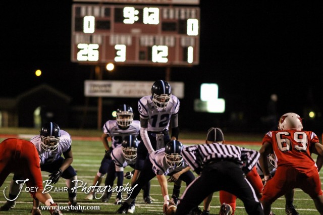 Cimarron Bluejay Nick Ast (#12) prepares to go under center during the Cimmaron versus Hoisington High School KSHSAA Class 3A Bi-District Football Game with Hoisington winning 48 to 6 at Elton Brown Field in Hoisington, Kansas on November 4, 2014. (Photo: Joey Bahr, www.joeybahr.com)