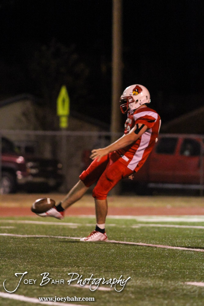 Hoisington Cardinal Chris Wright (#53) punts the ball during the Cimmaron versus Hoisington High School KSHSAA Class 3A Bi-District Football Game with Hoisington winning 48 to 6 at Elton Brown Field in Hoisington, Kansas on November 4, 2014. (Photo: Joey Bahr, www.joeybahr.com)