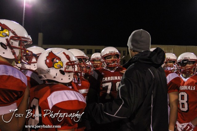 Hoisington Cardinal Head Coach Zach Baird addresses hi players following the Cimmaron versus Hoisington High School KSHSAA Class 3A Bi-District Football Game with Hoisington winning 48 to 6 at Elton Brown Field in Hoisington, Kansas on November 4, 2014. (Photo: Joey Bahr, www.joeybahr.com)