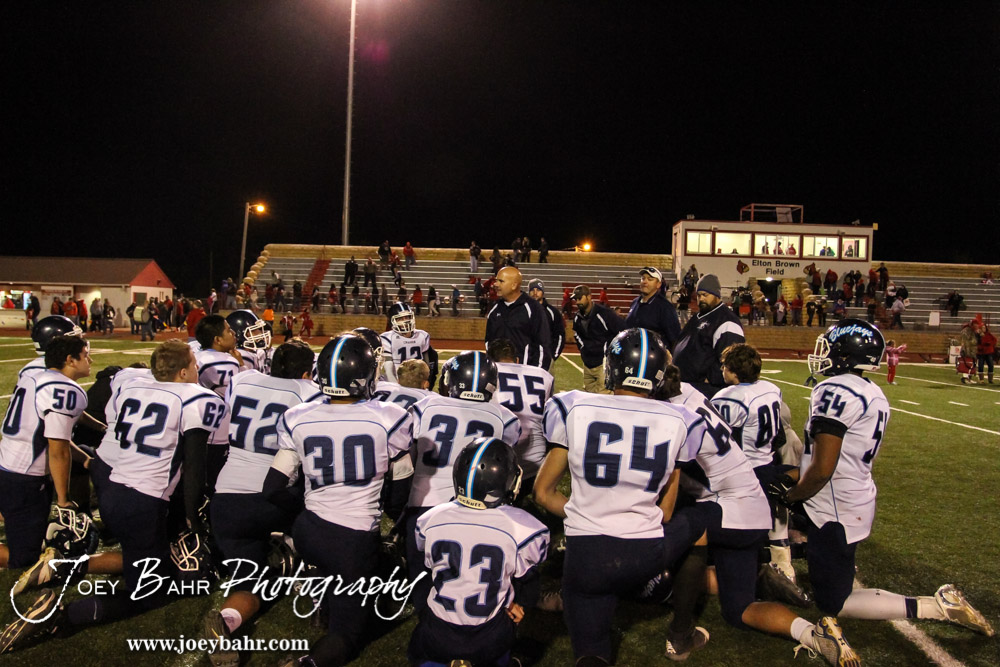 Cimarron Bluejay Head Coach Randall Rath talks to his players after the Cimmaron versus Hoisington High School KSHSAA Class 3A Bi-District Football Game with Hoisington winning 48 to 6 at Elton Brown Field in Hoisington, Kansas on November 4, 2014. (Photo: Joey Bahr, www.joeybahr.com)