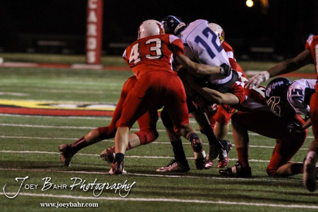 Hoisington Cardinal KC Stephens (#43) and other Cardinals tackle Cimarron Bluejay Nick Ast (#12) during the Cimmaron versus Hoisington High School KSHSAA Class 3A Bi-District Football Game with Hoisington winning 48 to 6 at Elton Brown Field in Hoisington, Kansas on November 4, 2014. (Photo: Joey Bahr, www.joeybahr.com)