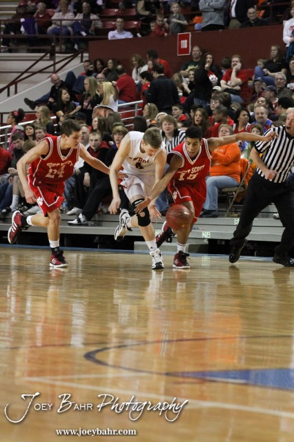 Abilene Cowboy Matthew Barlow (#3) and Fort Scott Tigers Cameron Woodring (#24) and Tyler Adams (#15) battle for a loose basketball in the 2012 Class 4A Boys State Championship Quarterfinals Game at Salina Bicentennial Center in Salina, Kansas on March 8, 2012. Photo: Joey Bahr