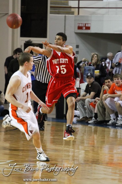 Fort Scott Tiger Tyler Adams (#15) passes the basketball to a teammate against the Abilene Cowboys in the 2012 Class 4A Boys State Championship Quarterfinals Game at Salina Bicentennial Center in Salina, Kansas on March 8, 2012. Photo: Joey Bahr