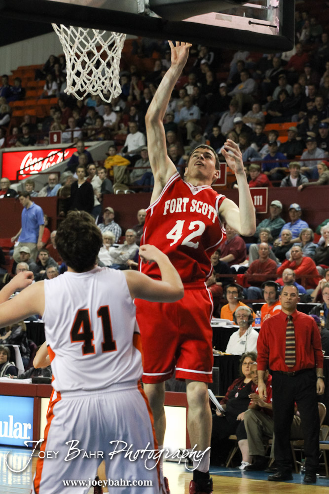 Kyle Altic (#42) of the Fort Scott Tigers goes up for a shot over Abilene Cowboy Jacob Harms (#41) in the 2012 Class 4A Boys State Championship Quarterfinals Game at Salina Bicentennial Center in Salina, Kansas on March 8, 2012. Photo: Joey Bahr