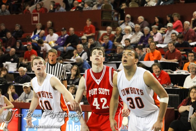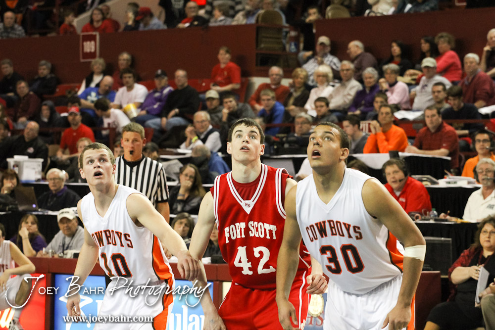 Abilene Cowboys Collin Sexton (#10) and Adrian Polk (#30) along with Fort Scott Tiger Kyle Altic (#42) watch a free throw attempt in the 2012 Class 4A Boys State Championship Quarterfinals Game at Salina Bicentennial Center in Salina, Kansas on March 8, 2012. Photo: Joey Bahr