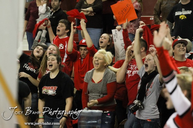 Students supporting the Fort Scott Tigers cheer as the final buzzer sounds in their win over the Abilene Cowboys in the 2012 Class 4A Boys State Championship Quarterfinals Game at Salina Bicentennial Center in Salina, Kansas on March 8, 2012. Photo: Joey Bahr