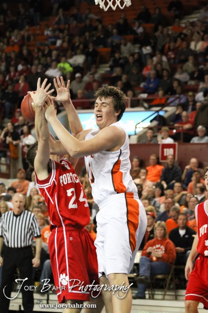 Abilene Cowboy Chad Beetch (#20) goes up for a shot against the defense of Fort Scott Tiger Cameron Woodring (#24) in the 2012 Class 4A Boys State Championship Quarterfinals Game at Salina Bicentennial Center in Salina, Kansas on March 8, 2012. Photo: Joey Bahr