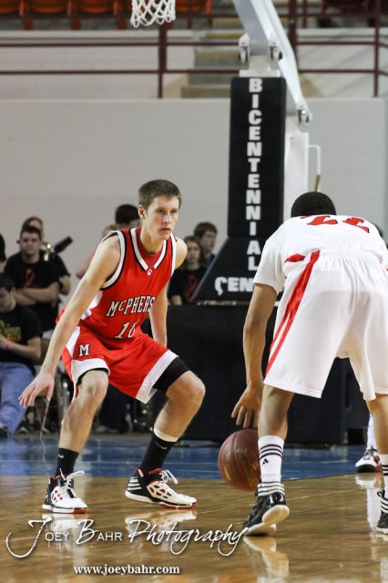 McPherson Bullpup Luke Reber (#10) defends Ottawa Cyclone Dallas Natt (#22) in the 2012 Class 4A Boys State Championship Quarterfinals Game at Salina Bicentennial Center in Salina, Kansas on March 8, 2012. Photo: Joey Bahr
