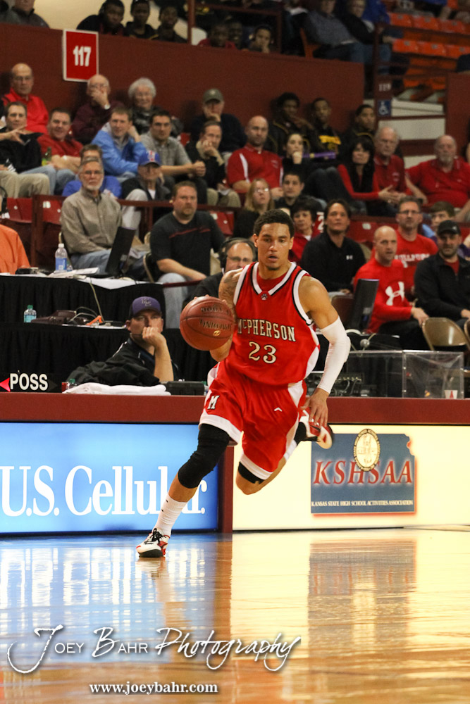 McPherson Bullpup Jordan Hart (#23) drives down the court with the basketball against the Ottawa Cyclones in the 2012 Class 4A Boys State Championship Quarterfinals Game at Salina Bicentennial Center in Salina, Kansas on March 8, 2012. Photo: Joey Bahr