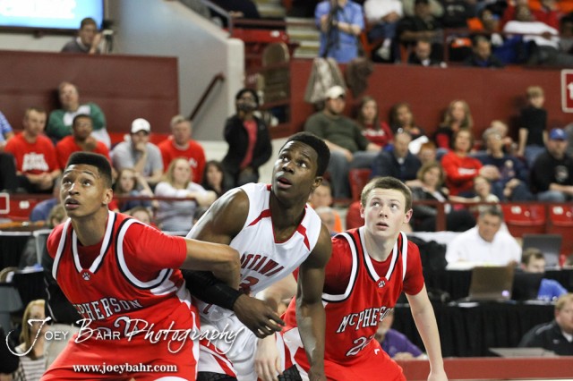 McPherson Bullpups Travell Robinson (#32) and Kyler Kinnamon (#22) and Ottawa Cyclone Semi Ojeleye (#33) watch a free throw attempt in the 2012 Class 4A Boys State Championship Quarterfinals Game at Salina Bicentennial Center in Salina, Kansas on March 8, 2012. Photo: Joey Bahr