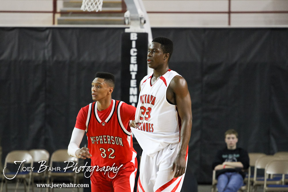 McPherson Bullpup Travell Robinson (#32) and Ottawa Cyclone Semi Ojeleye (#33) wait for the basketball to cross the half court line in the 2012 Class 4A Boys State Championship Quarterfinals Game at Salina Bicentennial Center in Salina, Kansas on March 8, 2012. Photo: Joey Bahr