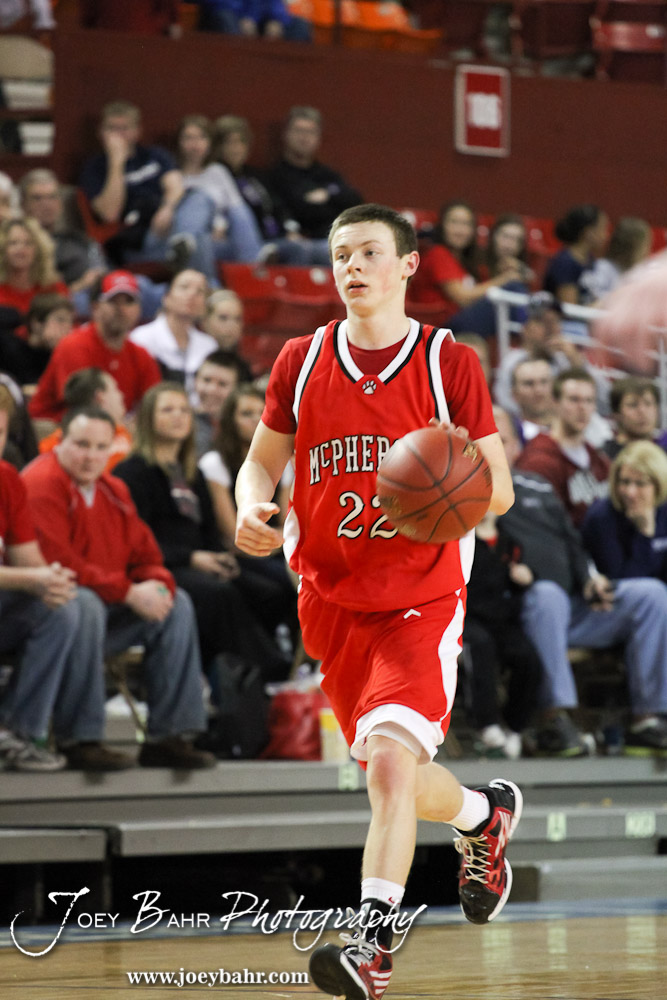 Kyler Kinnamon (#22) of the McPherson Bullpups carries the basketball down the court against the McPherson Bullpups in the 2012 Class 4A Boys State Championship Quarterfinals Game at Salina Bicentennial Center in Salina, Kansas on March 8, 2012. Photo: Joey Bahr