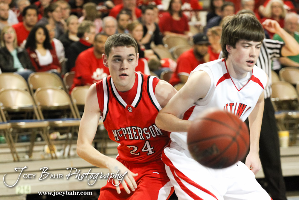 Alex Bahr (#24) of the McPherson Bullpups tries to get around an Ottawa Cyclone in the 2012 Class 4A Boys State Championship Quarterfinals Game at Salina Bicentennial Center in Salina, Kansas on March 8, 2012. Photo: Joey Bahr