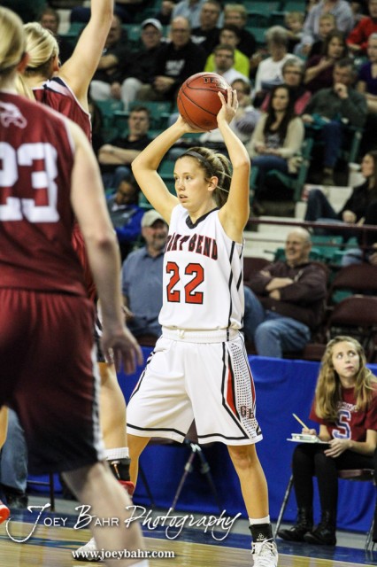 Great Bend Lady Panther McKenna Mauler (#22) looks for teammate pass the ball to during the KSHSAA Class 5A Girls Basketball Quarterfinal between the Great Bend Lady Panthers and the Seaman Lady Vikings with Great Bend winning 60 to 46 at the Kansas Expocentre’s Landon Arena in Topeka, Kansas on March 13, 2014. (Photo: Joey Bahr, www.joeybahr.com)