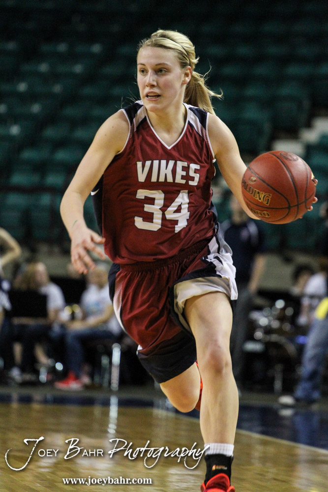 Topeka-Seaman Lady Viking Brooke McMillin (#34) drives the ball down the court during the KSHSAA Class 5A Girls Basketball Quarterfinal between the Great Bend Lady Panthers and the Seaman Lady Vikings with Great Bend winning 60 to 46 at the Kansas Expocentre’s Landon Arena in Topeka, Kansas on March 13, 2014. (Photo: Joey Bahr, www.joeybahr.com)