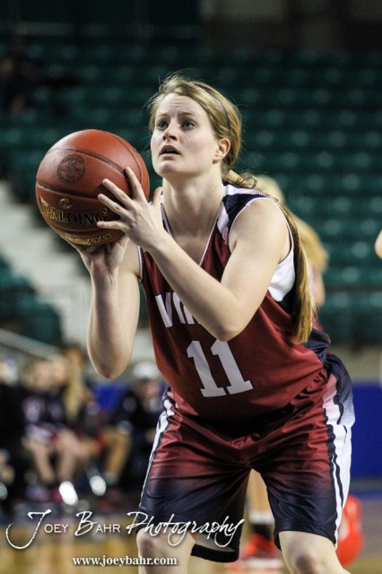 Topeka-Seaman Lady Viking Dani Spence (#11) lines up a free throw during the KSHSAA Class 5A Girls Basketball Quarterfinal between the Great Bend Lady Panthers and the Seaman Lady Vikings with Great Bend winning 60 to 46 at the Kansas Expocentre’s Landon Arena in Topeka, Kansas on March 13, 2014. (Photo: Joey Bahr, www.joeybahr.com)
