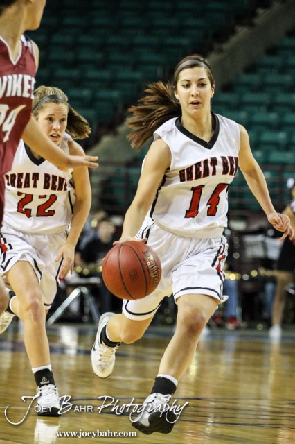 Great Bend Lady Panther Regan Unruh (#14) drives the down the court during the KSHSAA Class 5A Girls Basketball Quarterfinal between the Great Bend Lady Panthers and the Seaman Lady Vikings with Great Bend winning 60 to 46 at the Kansas Expocentre’s Landon Arena in Topeka, Kansas on March 13, 2014. (Photo: Joey Bahr, www.joeybahr.com)