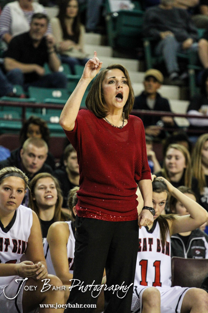 Great Bend Lady Panther Head Coach Carrie Minton signals in a play during the KSHSAA Class 5A Girls Basketball Quarterfinal between the Great Bend Lady Panthers and the Seaman Lady Vikings with Great Bend winning 60 to 46 at the Kansas Expocentre’s Landon Arena in Topeka, Kansas on March 13, 2014. (Photo: Joey Bahr, www.joeybahr.com)