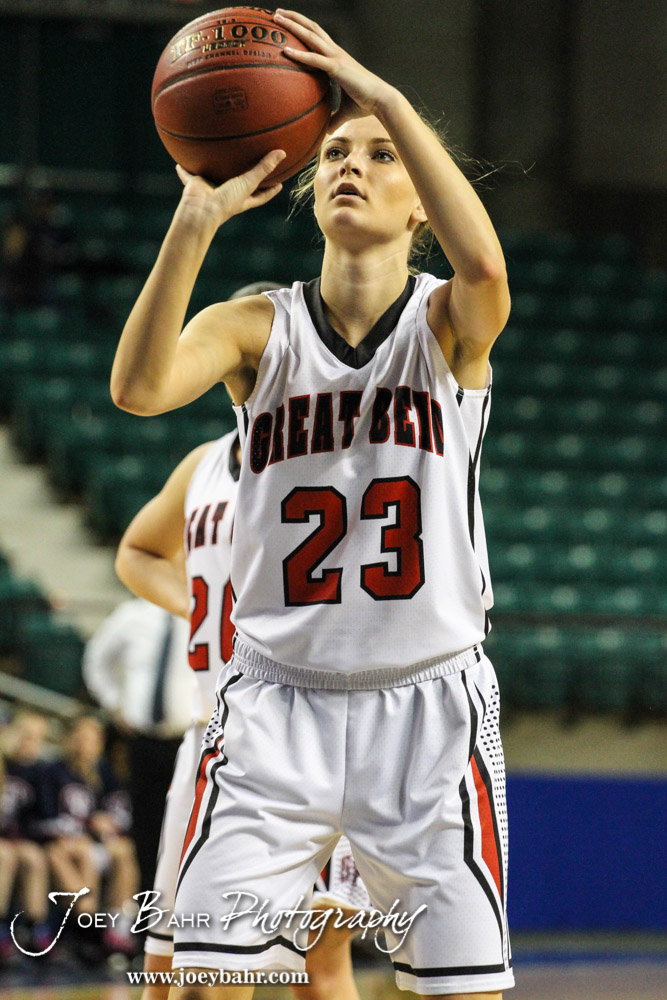 Great Bend Lady Panther Tarynn Stueder (#23) shoots a free throw during the KSHSAA Class 5A Girls Basketball Quarterfinal between the Great Bend Lady Panthers and the Seaman Lady Vikings with Great Bend winning 60 to 46 at the Kansas Expocentre’s Landon Arena in Topeka, Kansas on March 13, 2014. (Photo: Joey Bahr, www.joeybahr.com)