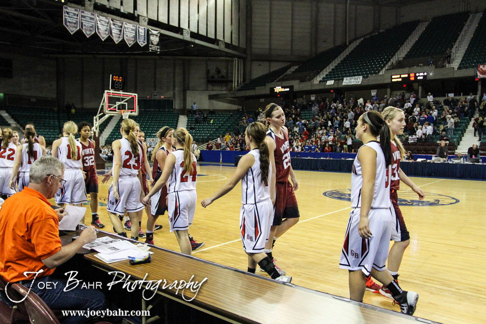 Members of the Great Bend Lady Panthers and Topeka-Seaman Lady Vikings shake hands following the KSHSAA Class 5A Girls Basketball Quarterfinal between the Great Bend Lady Panthers and the Seaman Lady Vikings with Great Bend winning 60 to 46 at the Kansas Expocentre’s Landon Arena in Topeka, Kansas on March 13, 2014. (Photo: Joey Bahr, www.joeybahr.com)