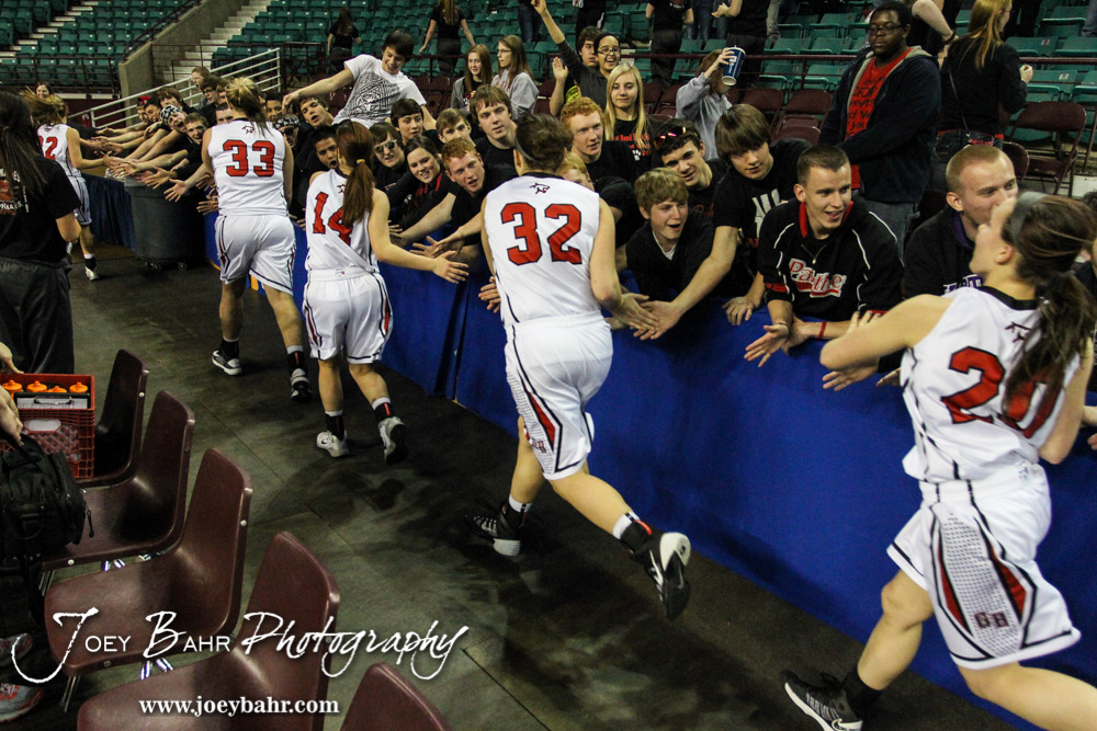 The Great Bend Lady Panthers shake the hands of fellow students following the KSHSAA Class 5A Girls Basketball Quarterfinal between the Great Bend Lady Panthers and the Seaman Lady Vikings with Great Bend winning 60 to 46 at the Kansas Expocentre’s Landon Arena in Topeka, Kansas on March 13, 2014. (Photo: Joey Bahr, www.joeybahr.com)