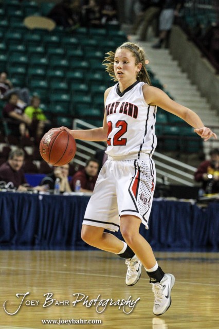 Great Bend Lady Panther McKenna Mauler (#22) dribbles the ball down the court during the KSHSAA Class 5A Girls Basketball Quarterfinal between the Great Bend Lady Panthers and the Seaman Lady Vikings with Great Bend winning 60 to 46 at the Kansas Expocentre’s Landon Arena in Topeka, Kansas on March 13, 2014. (Photo: Joey Bahr, www.joeybahr.com)