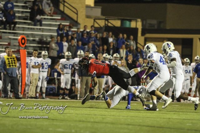 Great Bend Panther Cal Marshall (#11) flies through the air after being hit by Andover Trojan Preston Drake (#22). The Great Bend Panthers defeated the Andover Trojans in the KSHSAA Class 5A Regional playoff game with a score of 16 to 7 at Memorial Stadium in Great Bend, Kansas on November 4, 2016. (Photo: Joey Bahr, www.joeybahr.com)undefined