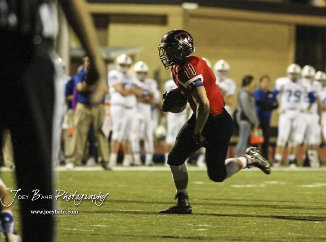 Great Bend Panther Cal Marshall (#11) rushes towards the end zone. The Great Bend Panthers defeated the Andover Trojans in the KSHSAA Class 5A Regional playoff game with a score of 16 to 7 at Memorial Stadium in Great Bend, Kansas on November 4, 2016. (Photo: Joey Bahr, www.joeybahr.com)undefined
