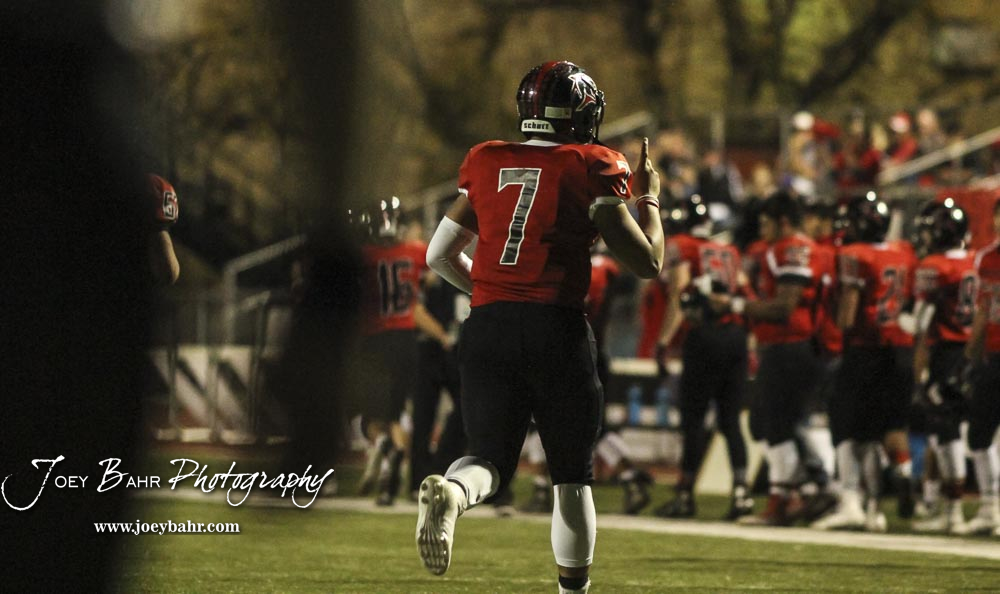 Great Bend Panther Jacob Murray (#7) celebrates scoring a touchdown. The Great Bend Panthers defeated the Andover Trojans in the KSHSAA Class 5A Regional playoff game with a score of 16 to 7 at Memorial Stadium in Great Bend, Kansas on November 4, 2016. (Photo: Joey Bahr, www.joeybahr.com)undefined