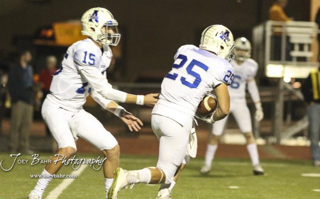 Andover Trojan Chase Oberg (#15) hands off the ball to Andover Trojan Robert Bundy (#25). The Great Bend Panthers defeated the Andover Trojans in the KSHSAA Class 5A Regional playoff game with a score of 16 to 7 at Memorial Stadium in Great Bend, Kansas on November 4, 2016. (Photo: Joey Bahr, www.joeybahr.com)undefined