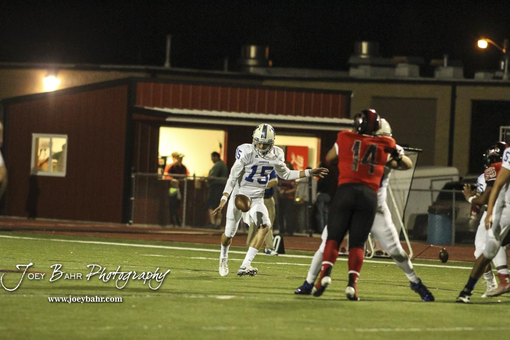Andover Trojan Chase Oberg (#15) punts the ball. The Great Bend Panthers defeated the Andover Trojans in the KSHSAA Class 5A Regional playoff game with a score of 16 to 7 at Memorial Stadium in Great Bend, Kansas on November 4, 2016. (Photo: Joey Bahr, www.joeybahr.com)undefined