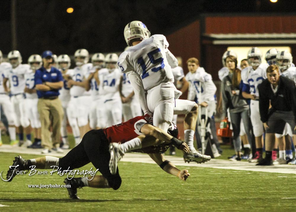 Great Bend Panther Payton Mauler (#32) tries to tackle a hurdling Andover Trojan Chase Oberg (#15). The Great Bend Panthers defeated the Andover Trojans in the KSHSAA Class 5A Regional playoff game with a score of 16 to 7 at Memorial Stadium in Great Bend, Kansas on November 4, 2016. (Photo: Joey Bahr, www.joeybahr.com)undefined