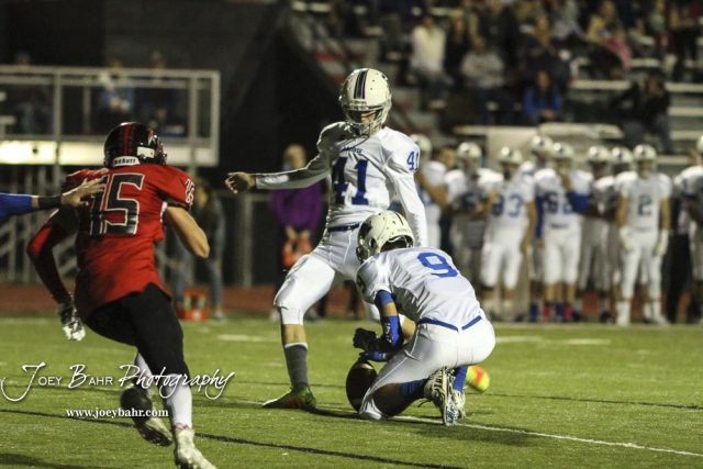 Andover Trojan Nate Bergman (#9) holds as Nathan Hammar (#41) kicks a Point After Touchdown. The Great Bend Panthers defeated the Andover Trojans in the KSHSAA Class 5A Regional playoff game with a score of 16 to 7 at Memorial Stadium in Great Bend, Kansas on November 4, 2016. (Photo: Joey Bahr, www.joeybahr.com)undefined