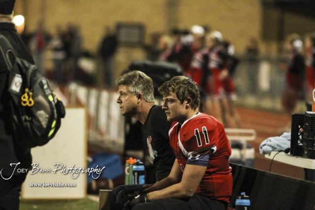 First Congressional District Candidate Dr. Roger Marshall sits next to his son Great Bend Panther Cal Marshall (#11) after he was evaluated for a concussion. The Great Bend Panthers defeated the Andover Trojans in the KSHSAA Class 5A Regional playoff game with a score of 16 to 7 at Memorial Stadium in Great Bend, Kansas on November 4, 2016. (Photo: Joey Bahr, www.joeybahr.com)undefined
