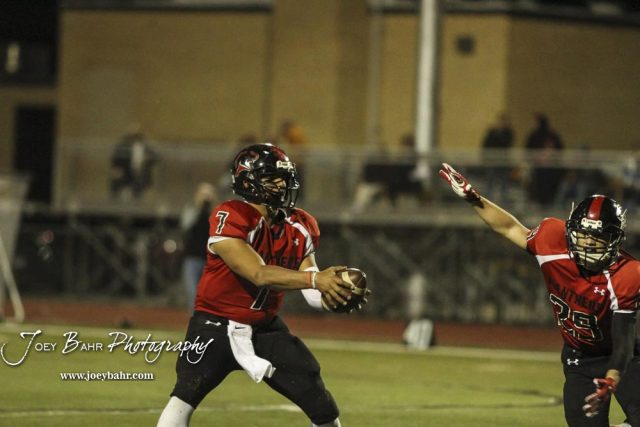 Great Bend Panther Jacob Murray (#7) fakes a hand off to Gage Fritz (#29). The Great Bend Panthers defeated the Andover Trojans in the KSHSAA Class 5A Regional playoff game with a score of 16 to 7 at Memorial Stadium in Great Bend, Kansas on November 4, 2016. (Photo: Joey Bahr, www.joeybahr.com)undefined