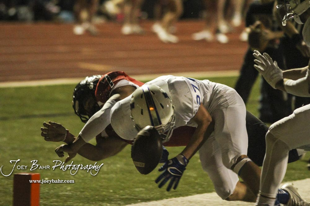 Andover Trojan Kale Rishel (#27) knocks Great Bend Panther Jacob Murray (#7) out of bounds close to the end zone. The Great Bend Panthers defeated the Andover Trojans in the KSHSAA Class 5A Regional playoff game with a score of 16 to 7 at Memorial Stadium in Great Bend, Kansas on November 4, 2016. (Photo: Joey Bahr, www.joeybahr.com)undefined