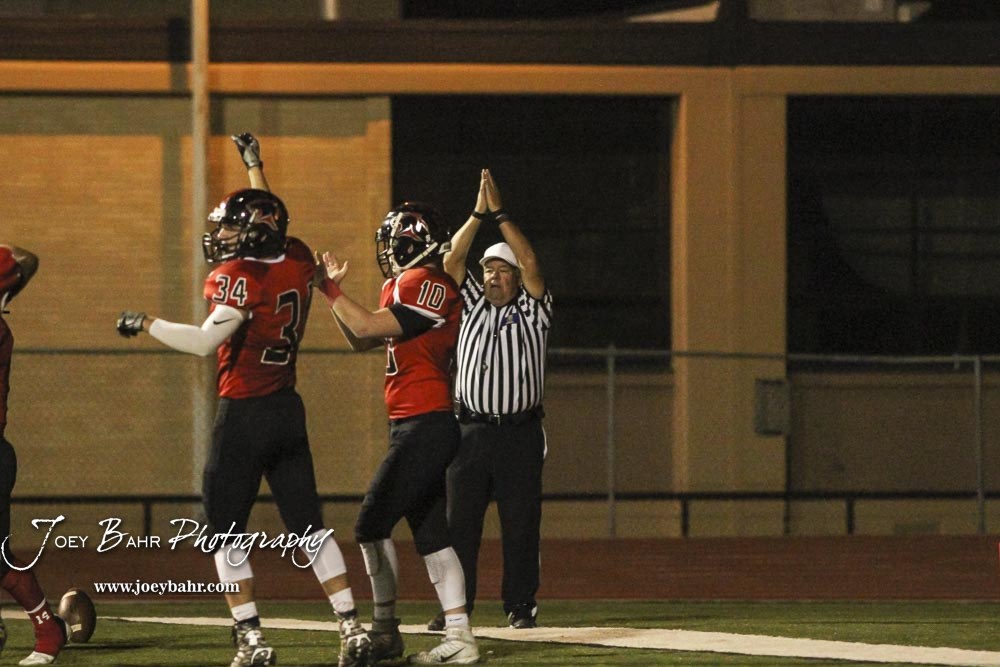 The Head Referee signals for a Safety after an errant snap gave Great Bend Panthers Blake Penka (#34) and Jensen Randall (#10) a reason to celebrate. The Great Bend Panthers defeated the Andover Trojans in the KSHSAA Class 5A Regional playoff game with a score of 16 to 7 at Memorial Stadium in Great Bend, Kansas on November 4, 2016. (Photo: Joey Bahr, www.joeybahr.com)undefined
