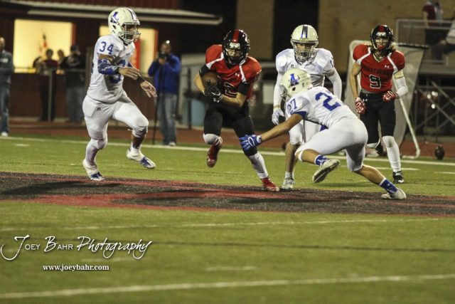 Andover Trojan Kale Rishel (#27) lowers him self to try and tackle Great Bend Panther Koy Brack (#12). The Great Bend Panthers defeated the Andover Trojans in the KSHSAA Class 5A Regional playoff game with a score of 16 to 7 at Memorial Stadium in Great Bend, Kansas on November 4, 2016. (Photo: Joey Bahr, www.joeybahr.com)undefined
